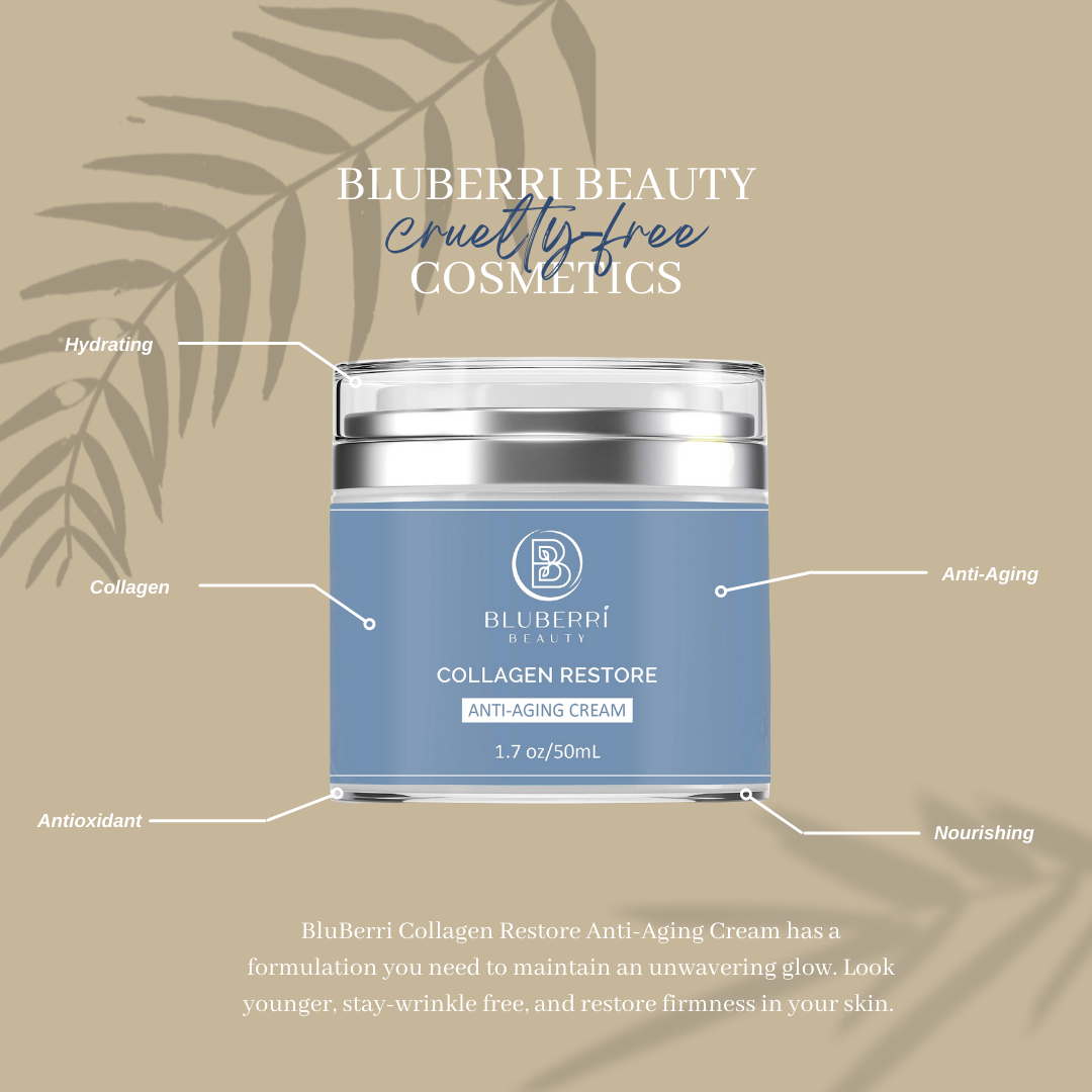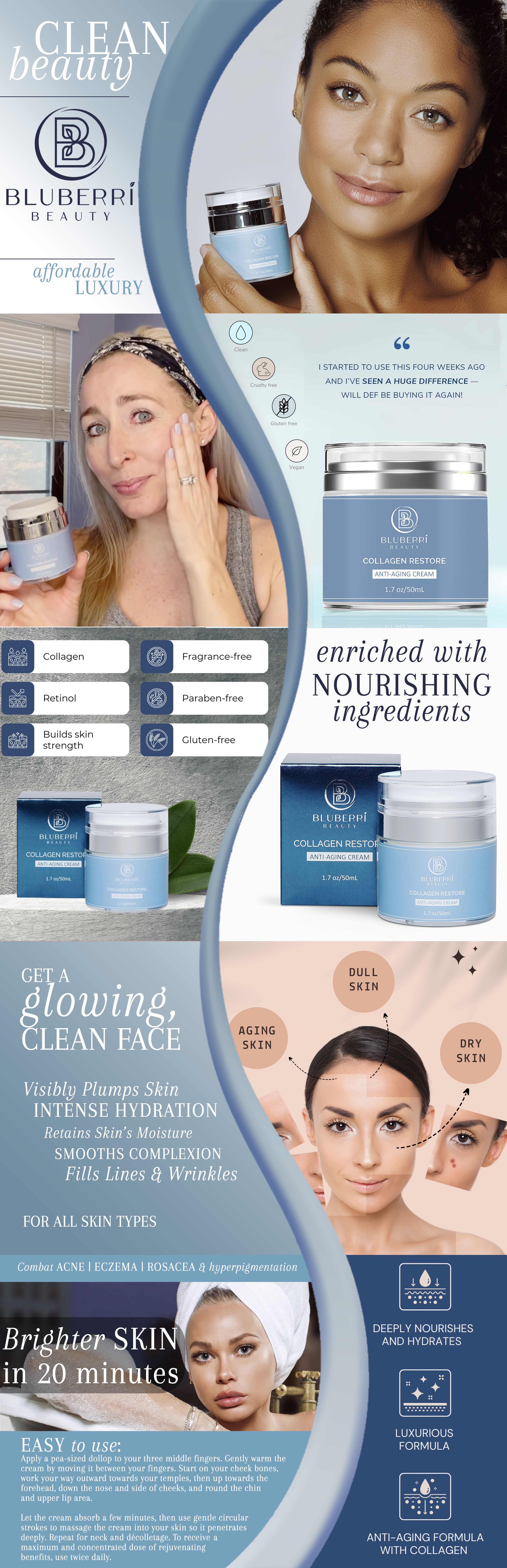 BluBerri Beauty Collagen Restore Anti-Aging Cream is a luxurious collagen filler moisture cream designed to help reduce the appearance of fine lines and wrinkles with natural collagen, while also improving the overall texture and radiance of the skin. This cream contains a blend of natural ingredients, including collagen, which helps to firm and plump the skin for a more youthful look. The formula is rich in antioxidants, which help protect the skin from environmental stressors that can cause signs of aging. Rich moisture instantly restores skin’s cushion and bounce It also contains nourishing ingredients like retinol palmitate and cocoa seed butter which provide deep hydration to the skin, leaving it feeling soft, smooth, and supple. BluBerri Beauty Collagen Restore Anti-Aging Cream has a lightweight, non-greasy texture that absorbs quickly into the skin, making it ideal for daily use. With regular use, this cream can help improve the overall health and appearance of the skin, leaving you with a more youthful, radiant complexion. Over time, the powerful natural Collagen helps fill in lines and wrinkles, leaving your skin smooth and plump. Use it for a complete collagen-infused skincare regime.
