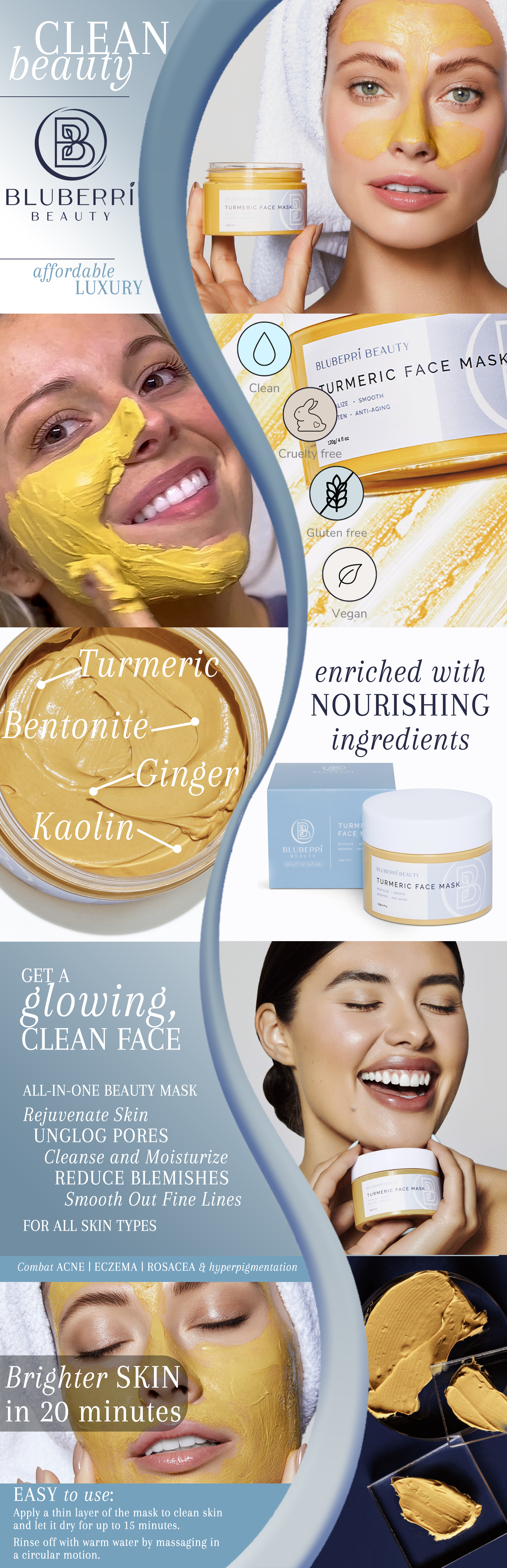 Apply a thin layer of the mask to clean skin and let it dry for up to 15min. Rinse off with warm water by massaging in a circular motion. Follow with a few drops of Booster Serum and apply your Daily Moisturizing Cream or Moisturizing Face Lotion. Start by using 1x weekly. May increase to 2-3x a week depending on your skin’s needs. *Note: avoid acne-fighting ingredients like acids or retinol for 1 day. irritating areas. PH-balanced and suitable for all types of skin: acne-prone, oily, dry, normal, or combination skin. The best skincare solution is the BluBerri Beauty turmeric clay mask!